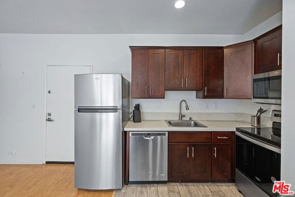 Welcome to refined boutique living at 1440 Veteran Avenue, a resort style condominium community in the heart of Westwood. This updated second floor, one bedroom residence offers a thoughtful blend of comfort, functionality, and upscale convenience. The open concept layout features nine foot ceilings, recessed lighting, and a remodeled kitchen with sleek stone countertops, stainless steel appliances, modern cabinetry, and a compact prep island with built in drawers and cabinetry for extra storage. The living and dining areas flow seamlessly to a west facing balcony, ideal for enjoying fresh air and golden hour light. Hardwood style vinyl plank flooring extends throughout, and newly installed double pane windows offer peaceful insulation. The bedroom features a south facing window and two closets, while the updated bathroom includes a shower over tub, modern vanity, and a window for natural light and ventilation. This unit can be offered partially furnished with the pieces shown in the photos, or delivered unfurnished if preferred. One assigned parking space is included in the gated garage, along with access to convenient bike storage rooms. The building offers 24 hour security, digital package tracking, an on site manager, a beautifully upgraded fitness center with Precor and Peloton equipment, steam room, sauna, party room with catering kitchen, lounge, conference room, and lush grounds with koi ponds, waterfalls, a heated pool and spa. Across the street, enjoy a sprawling park with tennis courts, basketball courts, soccer fields, and a dog park. Just minutes to UCLA, Westwood Village, and the upcoming Purple Line station, this exceptional home includes all utilities, with rent covering electricity, water, and trash. Immediate move in is available. Prospective tenants must meet minimum income and credit score requirements and will undergo a credit check, background check, criminal check, and eviction check through our third party screening service, RentSpree.