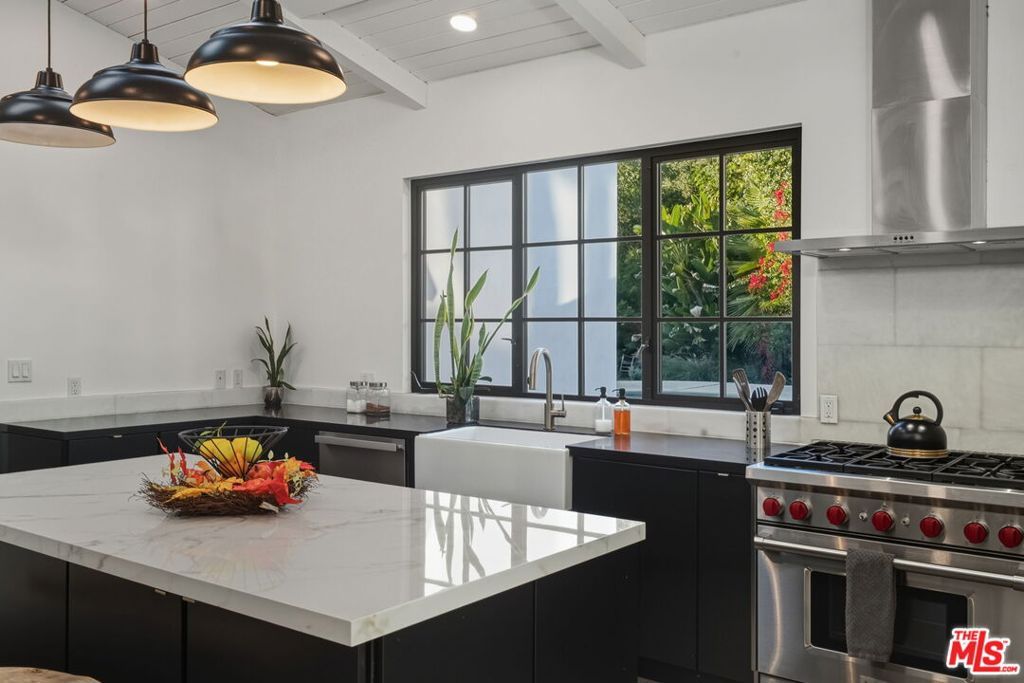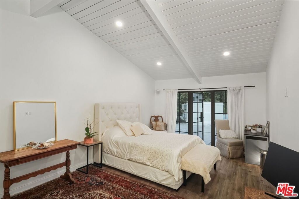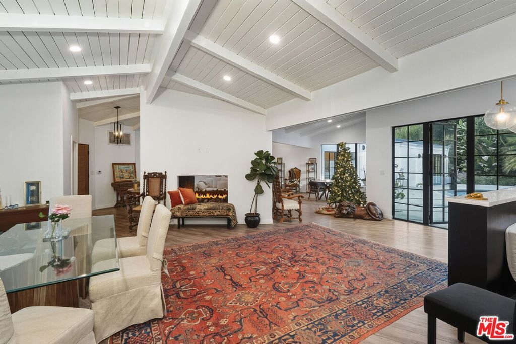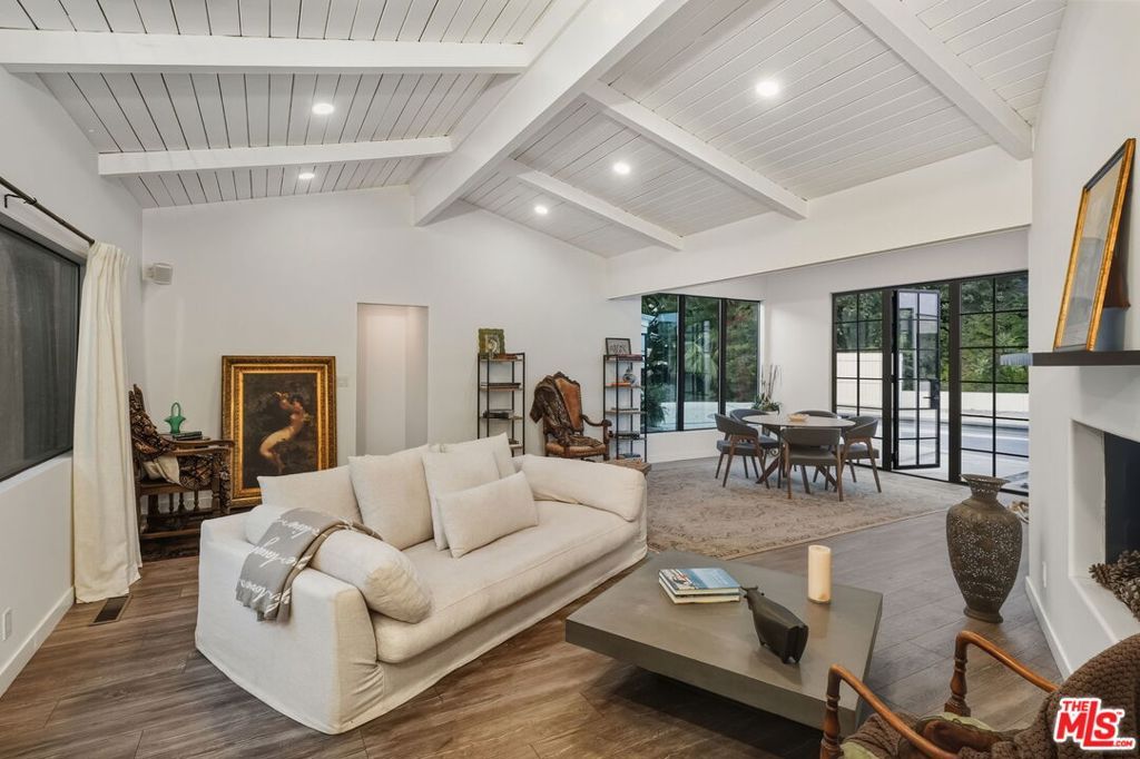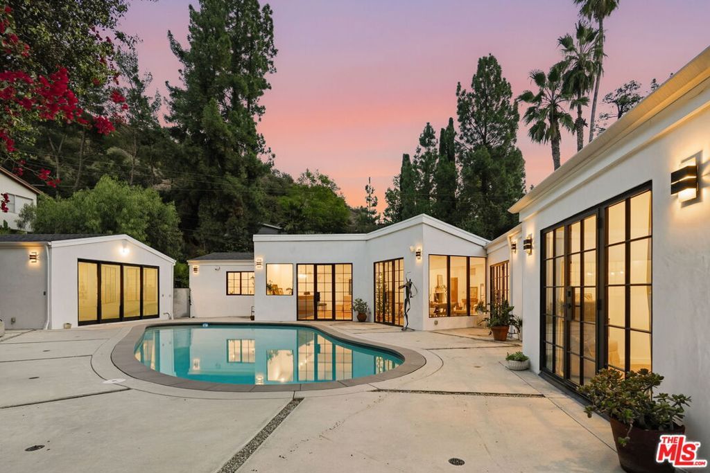 Striking Mid-Century Haven with Expansive Pool, Privacy & Canyon Views. Tucked behind a gated entrance off Upper Mandeville Canyon Road, this striking mid-century residence sits on a lush 12,455-square-foot lot dotted with mature myrtle and pepper trees. Thoughtfully expanded and remodeled, the 2,888 sqft architectural home blends timeless design with dramatic natural surroundings. Inside, ash veneer floors, pitched beam ceilings, skylights, and custom steel-framed windows and doors create a seamless indoor-outdoor experience, reflecting the expansive pool, patios, and serene canyon vistas beyond. The open living, dining, and family spaces offer warmth, flow, and abundant natural light, anchored by a luminous formal entry and double-sided fireplace. The chef's kitchen is a showstopper, wrapped in wide picture windows framing verdant nature and outfitted with stainless steel appliances, a center island, quartz countertops, and generous pantry storage. Ideal for entertaining, the layout connects effortlessly to both interior gathering areas and the outdoor oasis. A private bedroom wing features two guest bedrooms and a beautifully appointed shared bath with double vanity and custom tilework. The luxurious primary suite is a tranquil retreat, boasting clerestory windows, a spa-inspired bath with a freestanding tub and open shower, an oversized walk-in closet, and French steel doors that open directly to the pool. Additional highlights include an oversized two-car garage with 420 sqft of flexible utility space or studio potential, serpentine pavers surrounding the home, and a rare sense of serenity just moments from Brentwood's coveted dining/shopping scene.