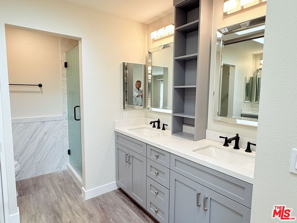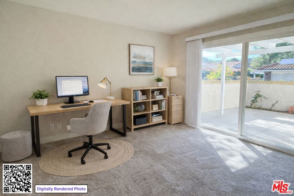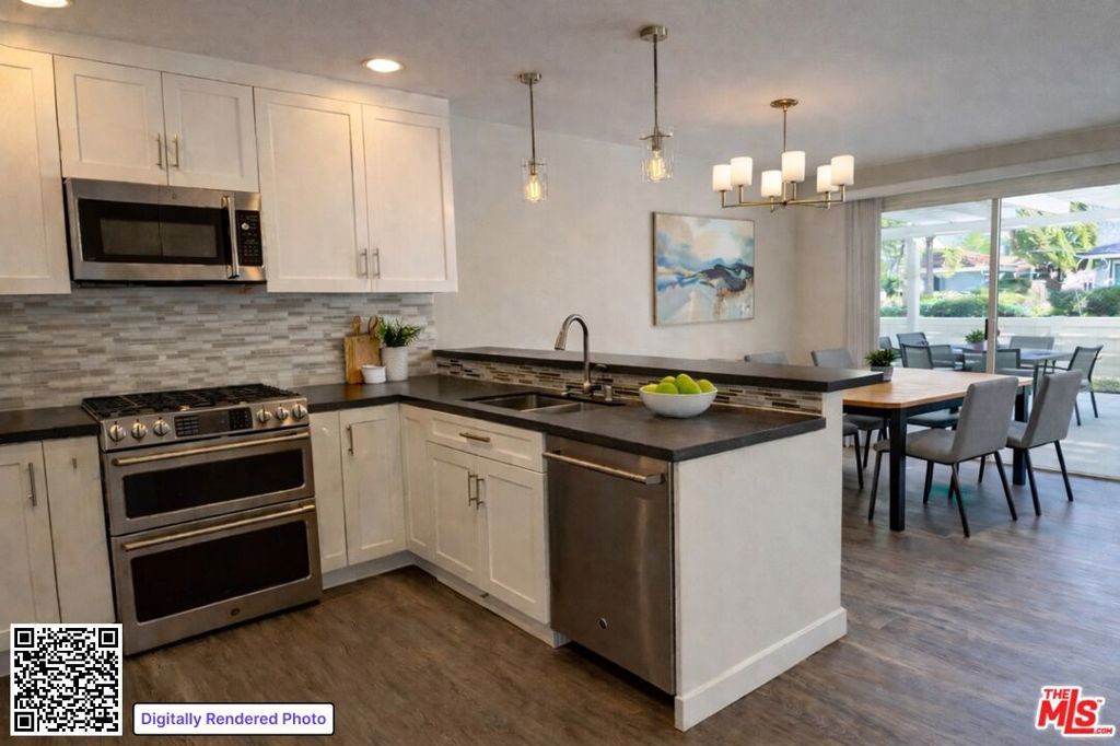 Ideally positioned within one of Westlake Village's most desirable greenbelt settings, this beautifully renovated 3-bedroom residence, or 2-bedroom plus den, offers exceptional indoor-outdoor living just moments from the lake and village amenities. The home has recently undergone two impressive phases of renovation, resulting in a refined yet inviting living environment. Luxury vinyl flooring flows throughout the public rooms, complementing the light, neutral palette and enhancing the sense of volume and continuity. The newly remodeled kitchen is both stylish and highly functional, featuring a premium stainless steel appliance suite, including a professional-style dual-oven gas range, built-in microwave, counter-depth French-door refrigerator, and dishwasher. Generous quartz-style counters, abundant cabinetry & storage, and a breakfast bar that open seamlessly to the expansive great room. Raised ceilings anchor the dining and living areas, creating an ideal setting for both everyday living and entertaining. Multiple sets of sliding glass doors extend the living space outdoors to a massive, private, walled patio overlooking a lush greenbelt framed by sycamores and other mature specimen trees. This rare combination of privacy, open outlook, and scale makes the location arguably one of the finest within the development and provides a tranquil, nature-forward backdrop throughout the home. Both bathrooms have just been fully and beautifully renovated with coordinated finishes and modern fixtures, and each features a skylight, as does the center hall, filling the interior with natural light throughout the day. The primary bedroom suite is notably spacious and functions as a true retreat, with glass sliders opening directly to the sunny rear patio and convenient access to the attached two-car garage. The second bedroom also enjoys direct patio access, offering flexibility for guests or extended living needs. Near the entry, a well-proportioned flex room serves easily as a den, home office, gym, entertainment or game room, or third bedroom. Thoughtfully updated, well laid out, and exceptionally located, this residence offers the best of Westlake Village, living close to the lake and village amenities, yet surrounded by serene, beautifully maintained greenbelt grounds.