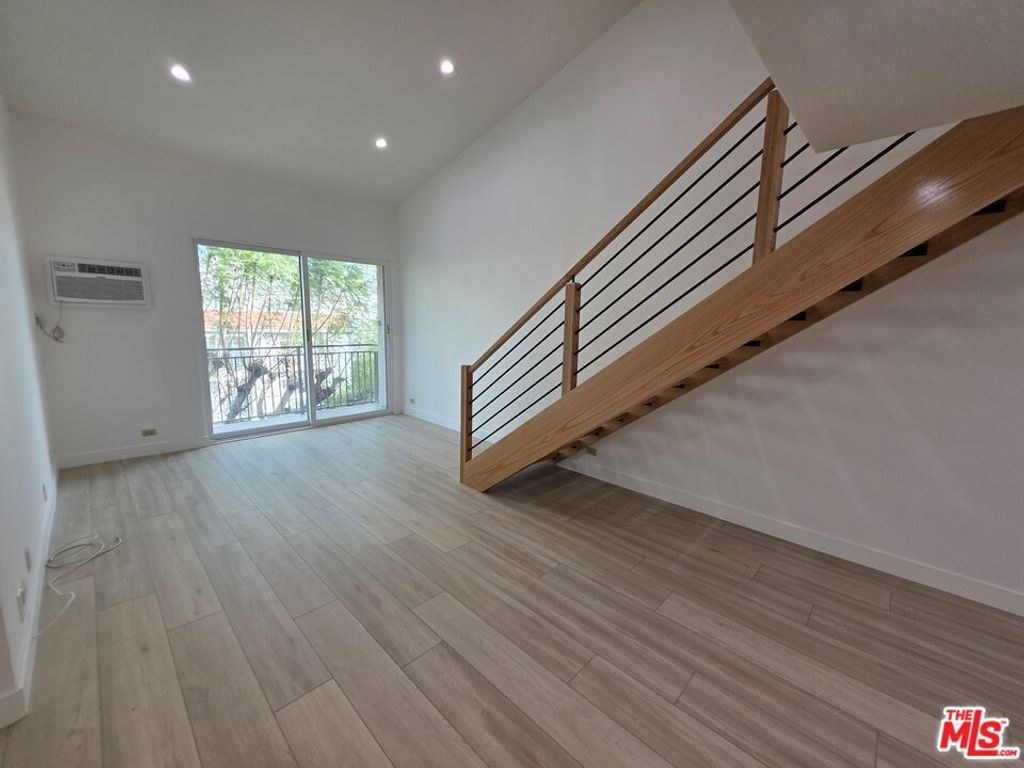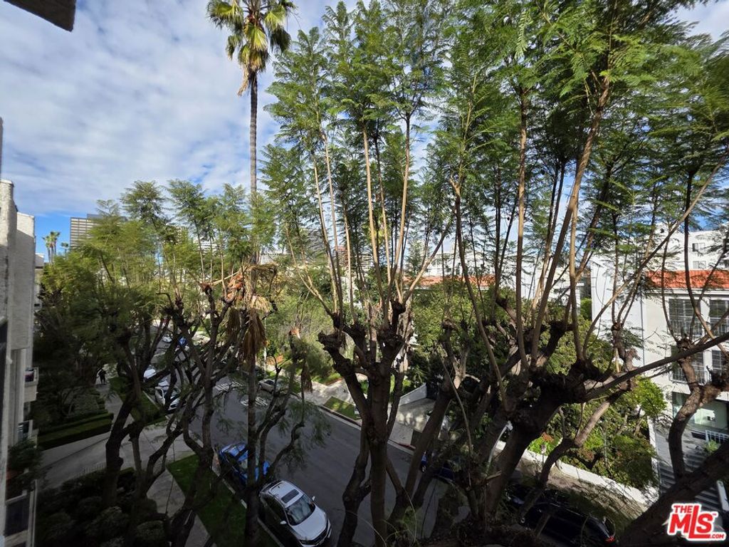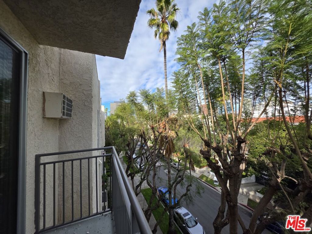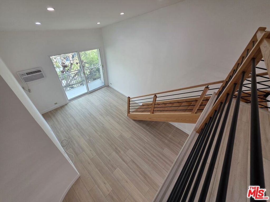 Wake up above the treetops in this fully renovated modern loft style condo that feels more like a boutique retreat than a typical Westwood rental. Set on the quiet top floor of the sought after Colony building, this home offers soaring vaulted ceilings, leafy neighborhood views, and glimpses of the Wilshire Corridor that glow in the evenings. Mornings begin in a serene resort setting with winding paths, waterfalls, koi ponds, and shaded lounge areas, while your day is supported by 24 hour security, on site management, package service, and a spa like fitness center with gym, steam room, and sauna. Inside, the expanded contemporary kitchen anchors the space with white shaker cabinetry, generous pantry storage, quartz countertops, and stainless steel appliances, opening effortlessly to the living area for relaxed dinners or entertaining friends. A brand new straight staircase leads to an airy open loft with a skylight and an oversized attached storage room, creating a flexible retreat for a home office or bedroom lounge. Downstairs, the private primary bedroom offers a calm escape with a tiled en suite bath featuring a shower over tub, thoughtfully separated from the loft for added privacy. New white oak look luxury vinyl plank flooring runs throughout, complemented by a new Milgard double paned bedroom window and sliding glass door that opens to a peaceful patio overlooking Kelton Street, framed by treetops and city views. With secured parking, EV charging, and utilities including electricity, water, and trash included, daily life feels effortless. Just across the street, a large park with tennis and basketball courts and a dog park adds to the lifestyle, while UCLA, Westwood Village, and the upcoming Purple Line station are moments away. Available for immediate occupancy, this move in ready home offers a refined, relaxed Westwood lifestyle that is easy to imagine and even easier to enjoy.