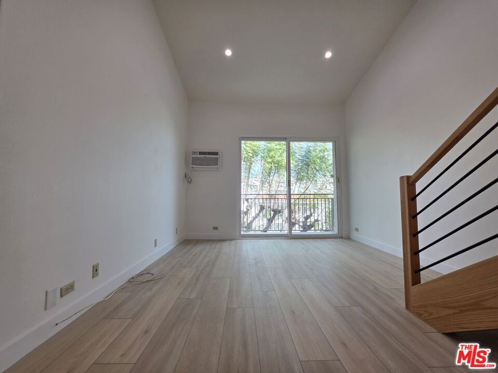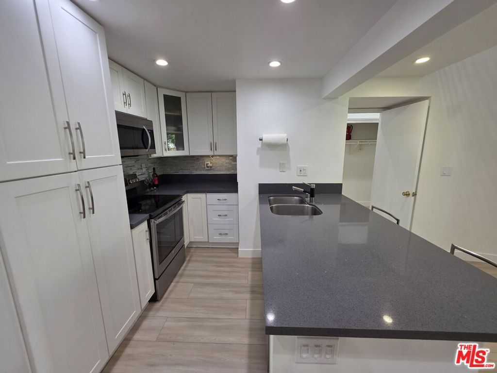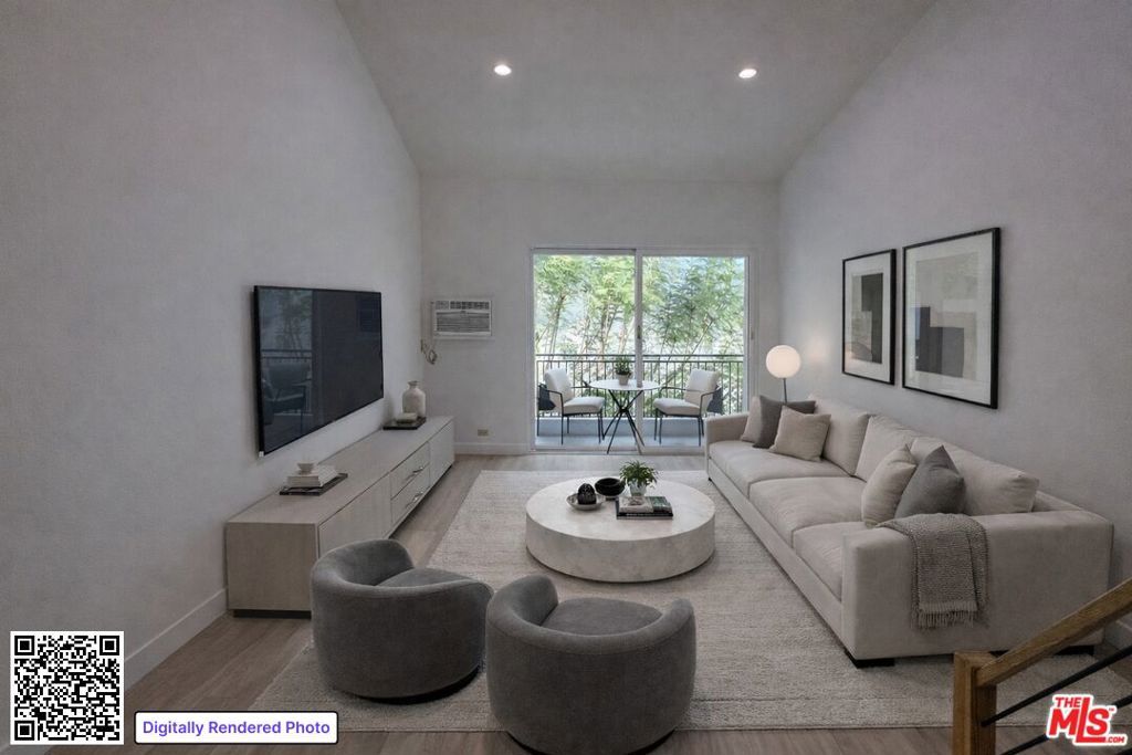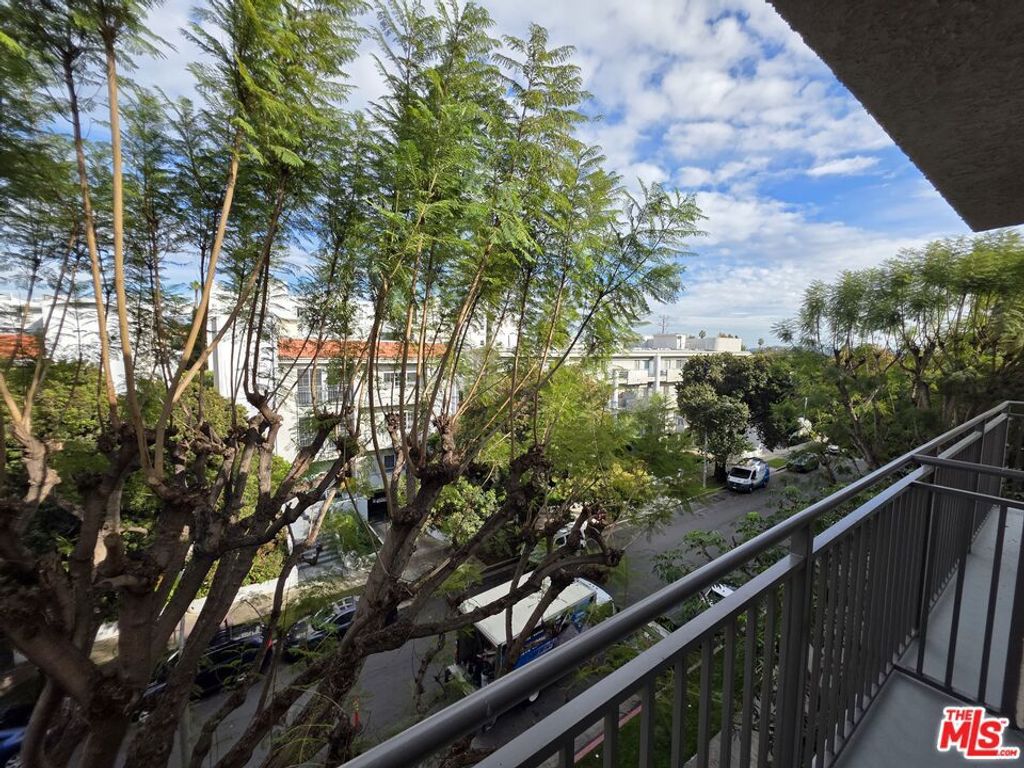 Wake up above the treetops in this fully renovated modern loft style condo that feels more like a boutique retreat than a typical Westwood rental. Set on the quiet top floor of the sought after Colony building, this home offers soaring vaulted ceilings, leafy neighborhood views, and glimpses of the Wilshire Corridor that glow in the evenings. Mornings begin in a serene resort setting with winding paths, waterfalls, koi ponds, and shaded lounge areas, while your day is supported by 24 hour security, on site management, package service, and a spa like fitness center with gym, steam room, and sauna. Inside, the expanded contemporary kitchen anchors the space with white shaker cabinetry, generous pantry storage, quartz countertops, and stainless steel appliances, opening effortlessly to the living area for relaxed dinners or entertaining friends. A brand new straight staircase leads to an airy open loft with a skylight and an oversized attached storage room, creating a flexible retreat for a home office or bedroom lounge. Downstairs, the private primary bedroom offers a calm escape with a tiled en suite bath featuring a shower over tub, thoughtfully separated from the loft for added privacy. New white oak look luxury vinyl plank flooring runs throughout, complemented by a new Milgard double paned bedroom window and sliding glass door that opens to a peaceful patio overlooking Kelton Street, framed by treetops and city views. With secured parking, EV charging, and utilities including electricity, water, and trash included, daily life feels effortless. Just across the street, a large park with tennis and basketball courts and a dog park adds to the lifestyle, while UCLA, Westwood Village, and the upcoming Purple Line station are moments away. Available for immediate occupancy, this move in ready home offers a refined, relaxed Westwood lifestyle that is easy to imagine and even easier to enjoy.