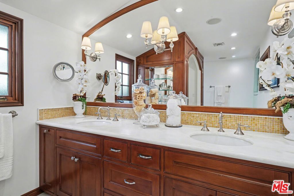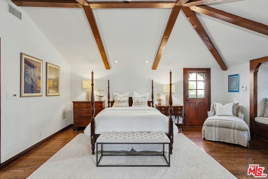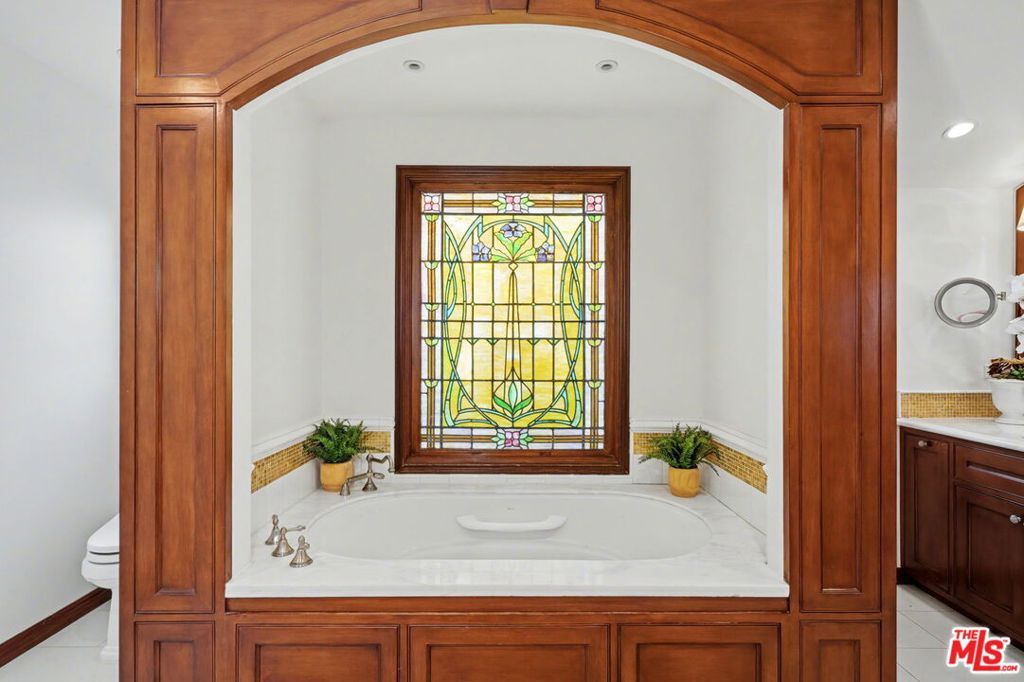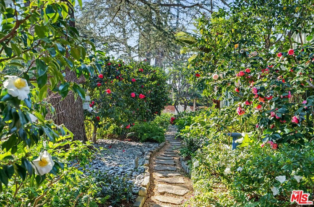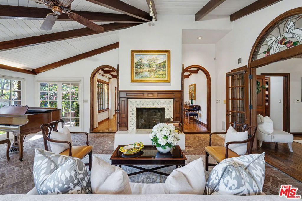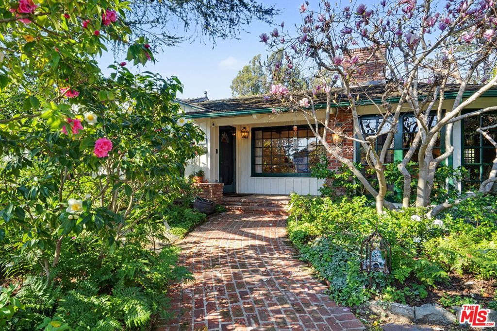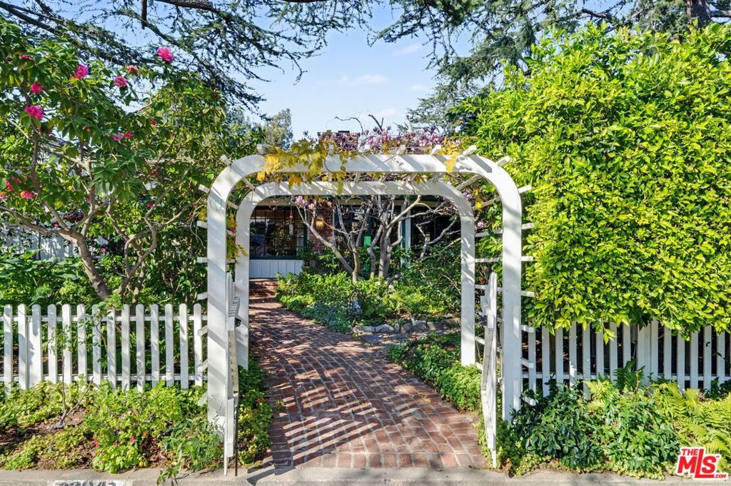 Offers to be received by Tuesday, 02/03 at 5 pm. Evoking the charm of Montecito's San Ysidro Ranch, this one-story traditional residence is set behind lush, mature landscaping in prestigious Brentwood Park. A covered front porch opens to a welcoming entry with a powder room and a spacious living room centered around a hand-carved fireplace, with large windows framing serene garden views. The formal dining room features a paneled butler's pantry that connects seamlessly to the spacious kitchen, which offers marble countertops, a butcher-block center island, double ovens, and a built-in brick barbecue overlooking the pool and grounds. The adjacent family room is an incredibly inviting place to relax, featuring high-beam ceilings, a charming fireplace, and built-in bookshelves. The resort-style pool was designed by renowned landscape architect Garrett Carlson and featured in a published work. The gardens are truly an exceptional sanctuary, with a koi pond, children's playhouse, and lush landscaping. A sunroom with soaring beam ceilings, a fireplace, and walls of glass provides seamless indoor-outdoor living. The primary suite overlooks the gardens and includes a spa-inspired bath with a steam shower. Three additional bedrooms offer flexible living, with one having direct outdoor access. Additional features include a two-car garage with direct access and a dedicated exercise space. Located on a private corner lot, which adds approximately 5,479 sqft of additional outdoor gated space. This rare single-level estate-style home offers warmth, privacy, and tranquility, moments from Brentwood's finest amenities.